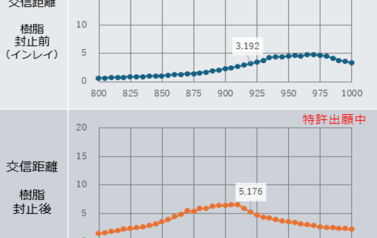※1:交信距離は電波暗室内 直線偏波2W ERPでの測定値です。リーダーライターの機能や出力、タグの貼付物、周辺環境などにより変化することがあります。